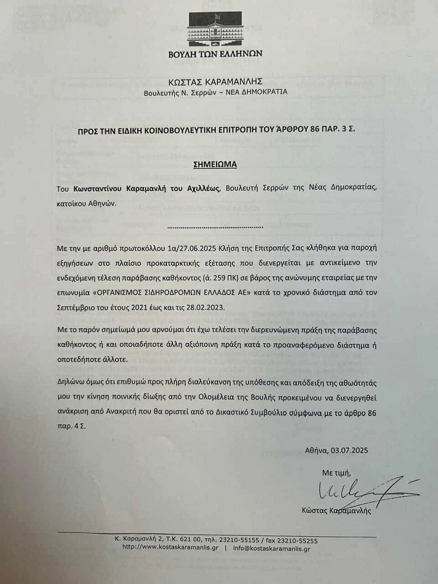 Την παραπομπή του στο Δικαστικό Συμβούλιο ζήτησε, όπως αναμενόταν, ο πρώην υπουργός Υποδομών και Μεταφορών, Κώστας Αχ. Καραμανλής, με υπόμνημα που κατέθεσε στην προανακριτική επιτροπή για την υπόθεση των Τεμπών.