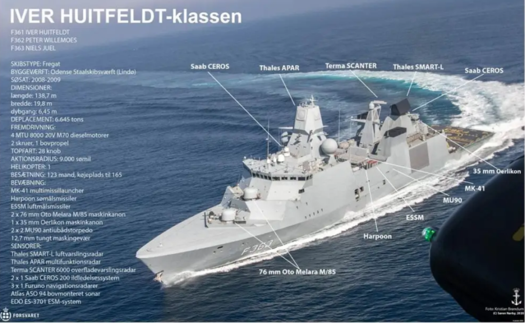 Κάθε φρεγάτα κλάσης Iver Huitfeldt διαθέτει συστοιχία 12 κυψελών Mk 56 Vertical Launch System (VLS) ειδικά για την εκτόξευση ESSM, τα οποία είναι βλήματα εδάφους-αέρος μικρού έως μεσαίου βεληνεκούς. Τα πλοία διαθέτουν επίσης μια συστοιχία Mk 41 VLS 32 κυψελών, συνήθως φορτωμένη με πυραύλους επιφανείας-αέρος μεσαίου έως μεγάλου βεληνεκούς, της σειράς SM-2. Διάφορα πολεμικά πλοία των ΗΠΑ και άλλα ξένα πολεμικά που δραστηριοποιούνται στην περιοχή έχουν επίσης ESSM, SM-2 και άλλους τύπους πυραύλων εδάφους-αέρος, στo οπλοστάσιo τους.