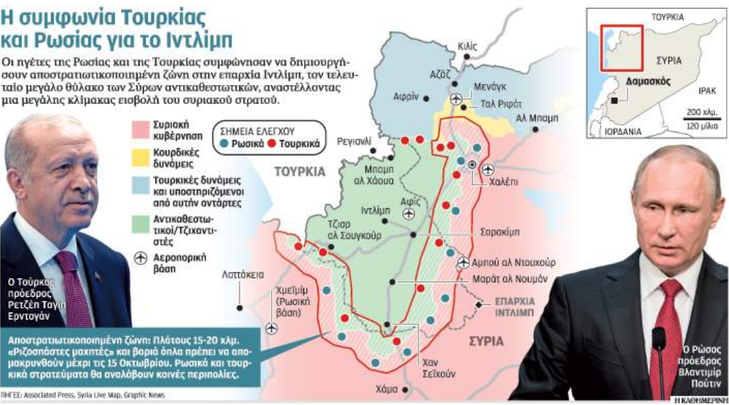 Τη Δευτέρα το απόγευμα βγήκε λευκός καπνός στο Σότσι, που φιλοξενούσε τη «μίνι Γιάλτα» Πούτιν – Ερντογάν για το Συριακό. Υστερα από πεντάωρες συνομιλίες, ο Ρώσος πρόεδρος υπαναχώρησε, αποδεχόμενος την πρόταση Ερντογάν για κατάπαυση του πυρός στο Ιντλίμπ. Η αναμενόμενη επίθεση ακυρώθηκε. Σε αντάλλαγμα, η Τουρκία υποτίθεται ότι θα εξασφαλίσει την έξοδο των «ακραίων» τζιχαντιστών και των βαρέων όπλων από μια αποστρατιωτικοποιημένη ζώνη πλάτους 15-20 χιλιομέτρων. Κοινές περιπολίες Ρώσων και Τούρκων θα επιτηρούν την εφαρμογή της συμφωνίας.