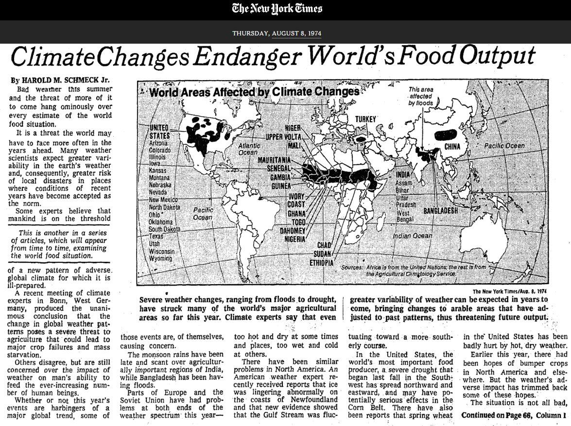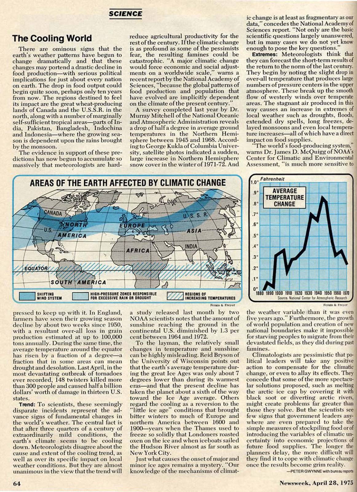 Αυτά γράφονται τον Αύγουστο 1974, τότε που οι εφημερίδες και τα περιοδικά προετοίμαζαν τους πολίτες για το πώς να επιβιώσουν απ’ την επερχόμενη εποχή των παγετώνων. Δείτε χαρακτηριστικά δημοσιεύματα εκείνης της εποχής, που μεταξύ άλλων αποκαλύπτουν και τους υπόγειους συνδέσμους των μεγάλων ΜΜΕ με τη CIA ή/και την κυβέρνηση των ΗΠΑ: “Πανεπιστήμιο του Ουισκόνσιν” λέει η CIA, “Πανεπιστήμιο του Ουισκόνσιν” λέει και το Newsweek. Φυσικά τίποτα δεν άλλαξε από τότε, ό,τι λένε οι κυβερνήσεις λένε και τα Μέσα Μαζικής Εξαπάτησης. Αλλά τώρα υπάρχει κι η δημοσιογραφία των πολιτών, που θυμίζει πως η δημοσίευση είναι η ψυχή της δημοκρατίας.