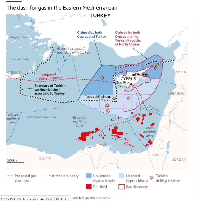 Αυτό που ξεκίνησε σαν μια διαμάχη μεταξύ της Τουρκίας και της Κύπρου τροφοδοτεί ένα περιφερειακό παιχνίδι εξουσίας, παρασέρνοντας κράτη που βρίσκονται ακόμα και στον Κόλπο και προκαλώντας βαθύτατη ανησυχία στην ΕΕ και στις ΗΠΑ. Το πιο πρόσφατο σημείο ανάφλεξης είναι η Λιβύη, όπου η Τουρκία φέτος επέκτεινε τη στρατιωτική της παρουσία, αφού έκλεισε συμφωνία με τη στηριζόμενη από τον ΟΗΕ κυβέρνηση στην Τρίπολη, που θα μπορούσε να δώσει τη δυνατότητα στην Άγκυρα να κάνει εξορύξεις πετρελαίου και αερίου ανοικτά των ακτών της Λιβύης.