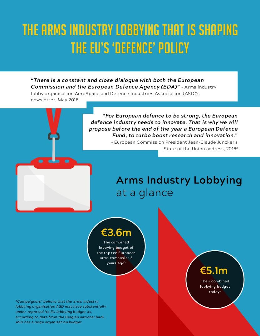 Το λόμπι της βιομηχανίας όπλων έχει φτάσει να επηρεάζει τον τρόπο που η ΕΕ αντιμετωπίζει τα ζητήματα της ασφάλειας και της άμυνας. Ο προϋπολογισμός της ΕΕ που προορίζεται για στρατιωτικές δαπάνες διαρκώς αυξάνεται. Τα σχέδιά της να χρηματοδοτήσει την έρευνα και την ανάπτυξη νέων οπλικών συστημάτων μέσω του ευρωπαϊκού ταμείου άμυνας αναδεικνύει την ταχύτητα με την οποία επιτυγχάνεται η στρατιωτικοποίηση της ΕΕ.
