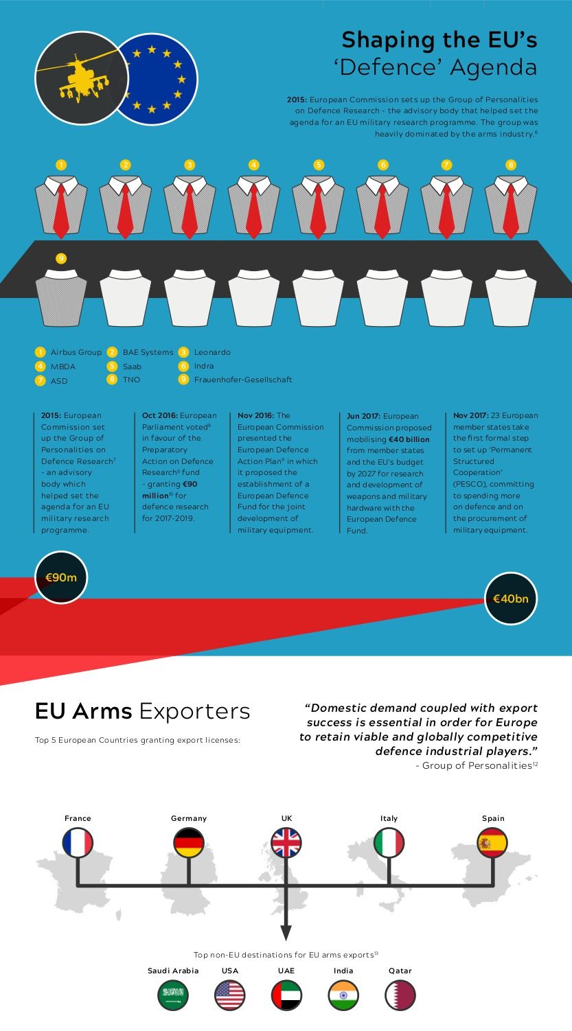 Το 2015 η Ευρωπαϊκή Επιτροπή δημιουργεί την Ομάδα Προσωπικοτήτων για την έρευνα για την Άμυνα. Στην ομάδα κυριαρχούν τα μέλη που προέρχονταν από τη βιομηχανία όπλων.