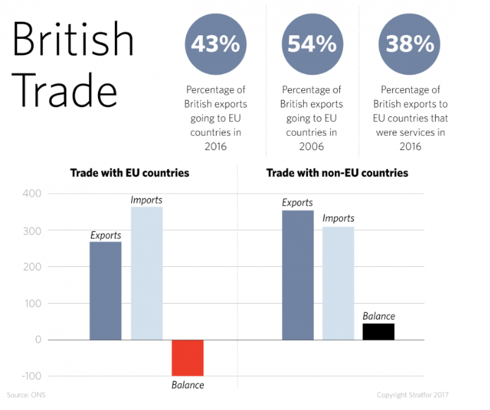 Από την πλευρά του, το Ηνωμένο Βασίλειο θα περάσει το 2018 διαπραγματευόμενο τους όρους μιας εμπορικής συμφωνίας με την Ευρωπαϊκή Ένωση. Αν και οι ηγέτες πιθανότατα θα καταλήξουν σε κάποιον διακανονισμό για την μεταβατική περίοδο μετά το Brexit, ωστόσο η επίτευξη εμπορικής συμφωνίας θα είναι δυσκολότερη.