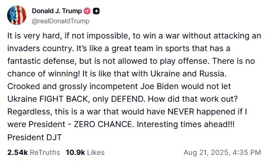 Αναλυτικά η ανάρτηση Τραμπ αναφέρει: « Είναι πολύ δύσκολο, αν όχι αδύνατο, να κερδίσεις έναν πόλεμο χωρίς να επιτεθείς στη χώρα του εισβολέα. Είναι σαν μία σπουδαία ομάδα στα σπορ που έχει φανταστική άμυνα, αλλά δεν της επιτρέπεται να παίξει επίθεση. Δεν υπάρχει καμία πιθανότητα νίκης! Έτσι είναι και με την Ουκρανία και τη Ρωσία. Ο διεφθαρμένος και εντελώς ανίκανος Τζο Μπάιντεν δεν άφησε την Ουκρανία να αντεπιτεθεί, μόνο να αμυνθεί. Πώς λειτούργησε αυτό; Όπως και να έχει, αυτός είναι ένας πόλεμος που δεν θα είχε συμβεί ποτέ αν ήμουν πρόεδρος. Πιθανότητα μηδέν. Ενδιαφέρουσες εποχές μπροστά μας».