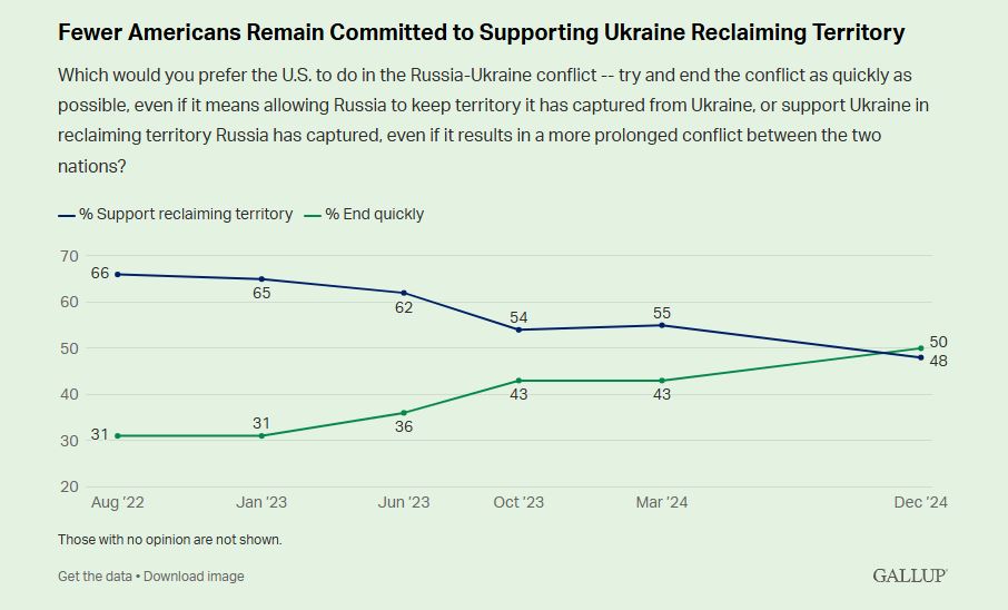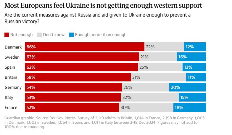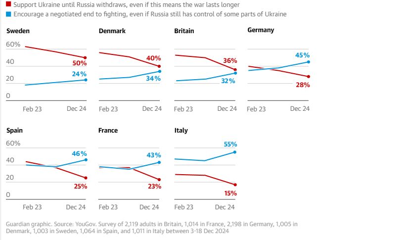 Επίσης, δείχνει ότι οι περισσότεροι πιστεύουν ότι ο Τραμπ θα εγκαταλείψει πολιτικά την Ουκρανία. Η δημοσκόπηση έδειξε ότι η προθυμία υποστήριξης της Ουκρανίας μέχρι να νικήσει παρέμεινε σχετικά υψηλή στη Σουηδία (50%) και τη Δανία (40%) και το Ηνωμένο Βασίλειο (36%) ωστόσο, τα ποσοστά καταγράφουν σημαντική πτώση και σε αυτές τις χώρες σε σχέση με τον περασμένο Ιανουάριο, όταν ήταν 57%, 51% και 50% αντίστοιχα. Με κόκκινο είναι τα “ναι” στην φράση “Υποστήριξη προς την Ουκρανία μέχρις ότου η Ρωσία αποσυρθεί από τα ουκρανικά εδάφη ακόμα κι αν ο πόλεμος κρατήσει περισσότερο” και με μπλε είναι τα “ναι” στη φράση “Να ενθαρρυνθεί η διαπραγμάτευση για ειρήνη ακόμα κι αν η Ρωσία διατηρήσει τον έλεγχο κάποιων τμημάτων της Ουκρανίας”