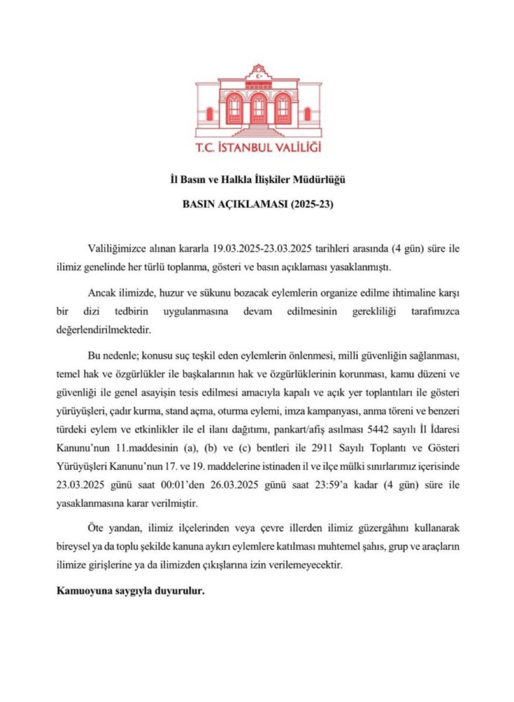«Ως εκ τούτου, για την αποτροπή πράξεων που συνιστούν εγκλήματα, για την εξασφάλιση της εθνικής ασφάλειας, για την προστασία των θεμελιωδών δικαιωμάτων και ελευθεριών, καθώς και για την προστασία των δικαιωμάτων και ελευθεριών των άλλων, για τη διατήρηση της δημόσιας τάξης και ασφάλειας και της γενικής ηρεμίας, απαγορεύονται όλες οι συγκεντρώσεις, πορείες, κατασκήνωση, στήσιμο πάγκων, καθιστικές διαμαρτυρίες, εκστρατείες συλλογής υπογραφών, τελετές μνήμης και άλλες παρόμοιες δράσεις, καθώς και η διανομή φυλλαδίων και η ανάρτηση πανό/αφισών, σύμφωνα με το άρθρο 11 του Νόμου 5442 για την Διοίκηση των Επαρχιών (α, β, γ) και τα άρθρα 17 και 19 του Νόμου 2911 περί Συγκεντρώσεων και Πορείων, εντός των ορίων της επαρχίας και των δήμων της Κωνσταντινούπολης από τις 23.03.2025 και ώρα 00:01 έως τις 27.03.2025 και ώρα 23:59 (για 4 ημέρες)».
