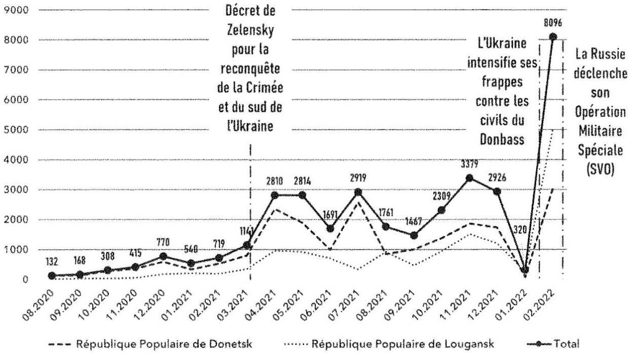 Κατά το ανωτέρω διάστημα (αρχές 2014 – αρχές 2022) τα σφυροκοπήματα στο Ντονμπάς έβαιναν αυξανόμενα, με 10.000 αμάχους φονευθέντες και 4.000 στρατιωτικούς. Ουδείς ομιλεί περί αυτών. Ενδεικτικό υπήρξε το αποκαλυπτικό φωτογραφικό υλικό που απέστειλε (17.02.2022) η Μαρία Ζαχάροβα (εκπρόσωπος του ρωσικού Υπουργείου Εξωτερικών) στην τότε Αμερικανίδα εκπρόσωπο Τύπου του Λευκού Οίκου, Τζεν Τσάκι περί τάφων αμάχων στο Ντονμπάς. Τότε, οι επιθέσεις στο Ντονμπάς ενετάθησαν έτι περαιτέρω (βλ. γράφημα κατωτέρω).