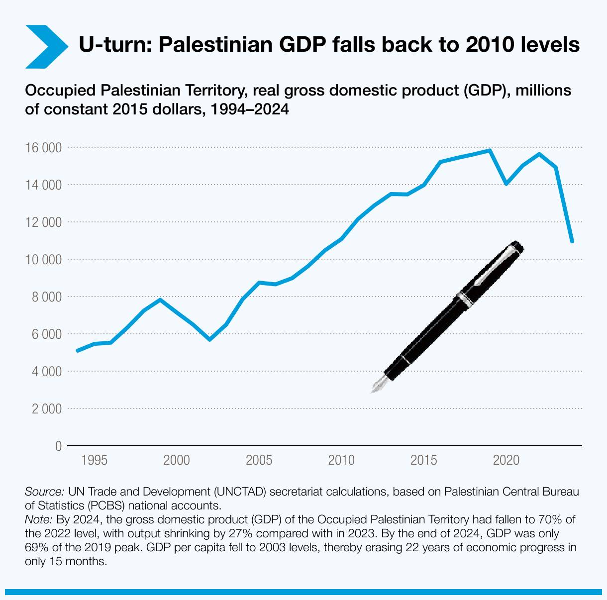 «Οι εκτεταμένες ζημιές σε υποδομές, παραγωγικά περιουσιακά στοιχεία και δημόσιες υπηρεσίες έχουν αντιστρέψει δεκαετίες κοινωνικοοικονομικής προόδου στα Κατεχόμενα Παλαιστινιακά Εδάφη», αναφέρεται σε αναλυτική παρουσίαση της έκθεσης. Η κατάσταση επιδεινώνεται για την παλαιστινιακή κυβέρνηση διότι εκτός από την κατακόρυφη πτώση των εσόδων έχει να αντιμετωπίσει και την παρακράτηση δημοσιονομικών μεταβιβάσεων από την ισραηλινή κυβέρνηση.