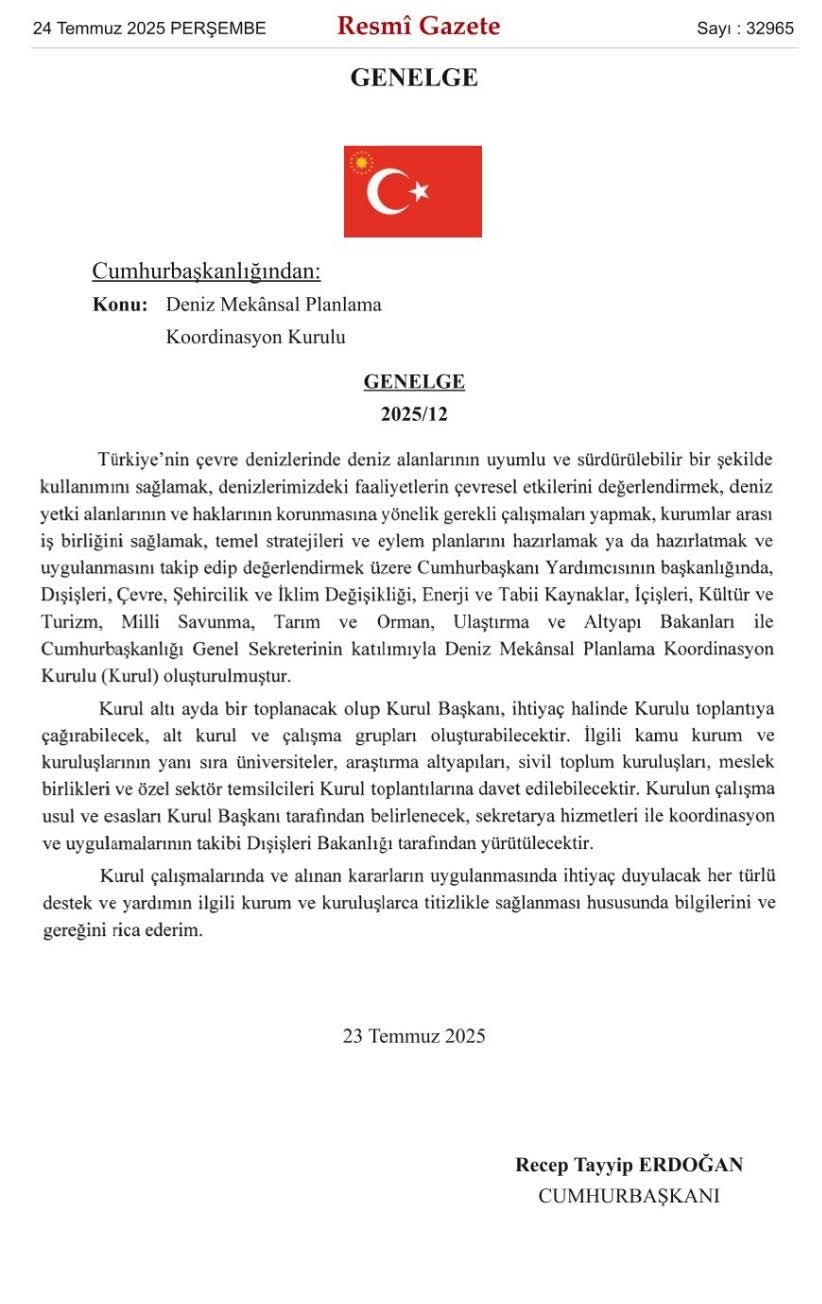 Η τουρκική Προεδρική Εγκύκλιος (2025/12) που δημοσιεύθηκε στην Επίσημη Εφημερίδα της Τουρκίας στις 24 Ιουλίου 2025, αφορά την ίδρυση του «Συντονιστικού Συμβουλίου Χωρικού Σχεδιασμού Θαλάσσιου Χώρου» (Deniz Mekânsal Planlama Koordinasyon Kurulu). Πρόκειται για ένα θεσμικό όργανο υπό τον Αντιπρόεδρο της Τουρκίας, στο οποίο συμμετέχουν 11 υπουργεία και η Γενική Γραμματεία της Προεδρίας.