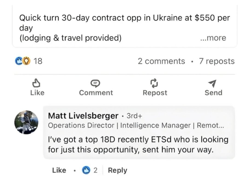 Επιπλέον, υπάρχει διαδικτυακή ανάρτηση που αποδίδεται στον Λιβελσμπέργκερ, όπου φαίνεται να αναφέρεται σε συμβόλαια που σύναπτε στην Ουκρανία, με αμοιβή 550 $ ημερησίως.