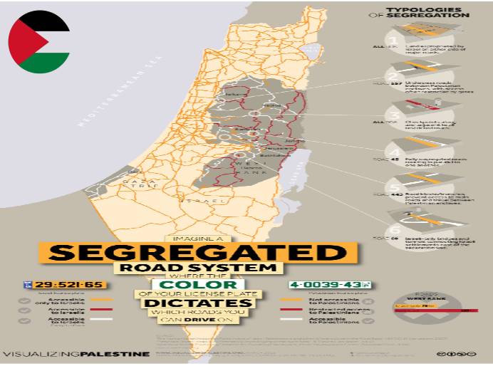Στα κατεχόμενα εδάφη της Δυτικής Όχθης οι Ισραηλινοί έποικοι απολαμβάνουν πλήρη ελευθερία μετακίνησης, όταν την ίδια στιγμή ένας Παλαιστίνιος για να διασχίσει την απόσταση των 30 χλμ που χωρίζει τη Ραμάλα από τη Βηθλεέμ πρέπει να σταματήσει σε 98 μόνιμα σημεία ελέγχου! Το οδικό δίκτυο της Δυτικής Όχθης είναι δίκτυο όχι επικοινωνίας αλλά αποκλεισμού που περιλαμβάνει 557 υπόγειες διαβάσεις μεταξύ των παλαιστινιακών θυλάκων με πύλες ασφαλείας, 645 σταθερά check points, 45 αυτοκινητόδρομους με πλήρως απομονωμένες λωρίδες για Παλαιστίνιους και Ισραηλινούς και 60 γέφυρες για αποκλειστική χρήση παράνομων Εβραίων εποίκων της Δυτικής Όχθης!