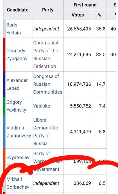 Η υποψηφιότητα Γκορμπατσώφ βρέθηκε πολύ πίσω ακόμα και από τον Βλαντιμίρ Ζιρινόφσκι, τον γραφικό και θηριώδη υποψήφιο της ρωσικής ακροδεξιάς, που οραματίζονταν “πλύνει τις μπότες του στον Ινδικό Ωκεανό”! Ο Ζιρινόφσκι πέθανε τον περασμένο Απρίλιο από κορονοϊό και ο Πούτιν απέτινε φόρο τιμής στην κηδεία του και μάλιστα δάκρυσε. Αν και εξέφρασε τα συλλυπητήρια του στην οικογένεια του Γκορμπατσώφ, μοιάζει δύσκολο να κλάψει ο Πούτιν για τον πολιτικό που διέλυσε την “πατρίδα της καρδιάς του”. Το ίδιο ισχύει και για την συντριπτική πλειονότητα των Ρώσων πολιτών.