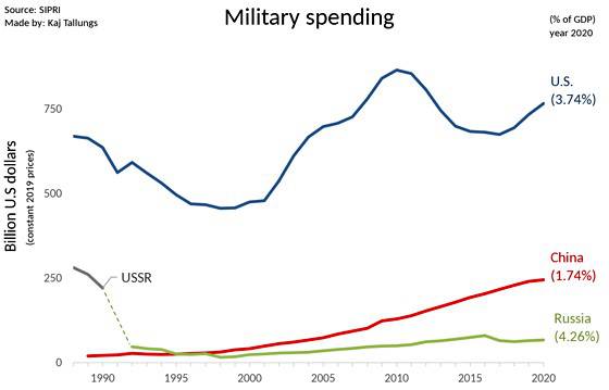 Αρχίζοντας από τη Ρωσία το 1990 το ΑΕΠ της ήταν $500 δις. Σήμερα είναι $1,7 δις. Οι στρατιωτικές δαπάνες Ρωσίας και ΗΠΑ φαίνονται στο πάρα κάτω διάγραμμα. Ποτέ στην ιστορία της ανθρωπότητας δεν παρουσιάστηκε τέτοια μείωση εξοπλισμών μετά από μία συμφωνία η οποία διέλυσε τις μία από τις δύο αντιμαχόμενες παρατάξεις εκτός από την περίπτωση στρατιωτικής ήττας του ενός εκ των δύο.