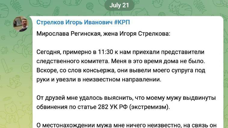 Το ειδησεογραφικό δίκτυο RBC της Μόσχας μετέδωσε ότι ο Γκίρκιν συνελήφθη σήμερα Παρασκευή, με κατηγορίες για σχεδιασμό τρομοκρατικών ενεργειών, αλλά δεν έχει γίνει γνωστό ούτε πως και που συνελήφθη, ούτε που κρατείται. Ο Γκίρκιν ήταν διοικητής των συνεργατών της Ρωσίας, φιλορώσων αποσχιστών στην ανατολική Ουκρανία το 2014, ενώ έχει καταδικαστεί ερήμην από ολλανδικό δικαστήριο για την κατάρριψη της πτήσης MH17 της Malaysian Airlines, την οποία είχαν κάνει με αντιαεροπορικά όπλα οι αποσχιστές την ίδια χρονιά. Η κράτησή του ωστόσο δεν σχετίζεται με την καταδίκη του στην Ολλανδία, αλλά, όπως δήλωσε η σύζυγός του, σε ανάρτησή της στο Telegram, με κατηγορίες για “εξτρεμισμό”.