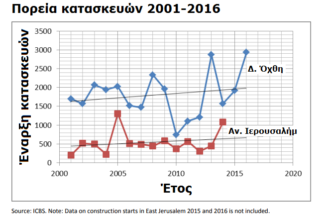 Έντονη οικοδομική δραστηριότητα ανέπτυξαν οι Ισραηλινοί στη Δυτική Όχθη, το πρώτο εξάμηνο του 2017, κατά παράβαση του διεθνούς δικαίου, προκαλώντας ανησυχία στην ΕΕ. Όπως αναφέρει η εξαμηνιαία έκθεση που δημοσίευσε η Ευρωπαϊκή Υπηρεσία Εξωτερικής Δράσης, σχεδόν 8.000 σπίτια, είτε χτίστηκαν είτε βρίσκονται υπό σχεδιασμό.