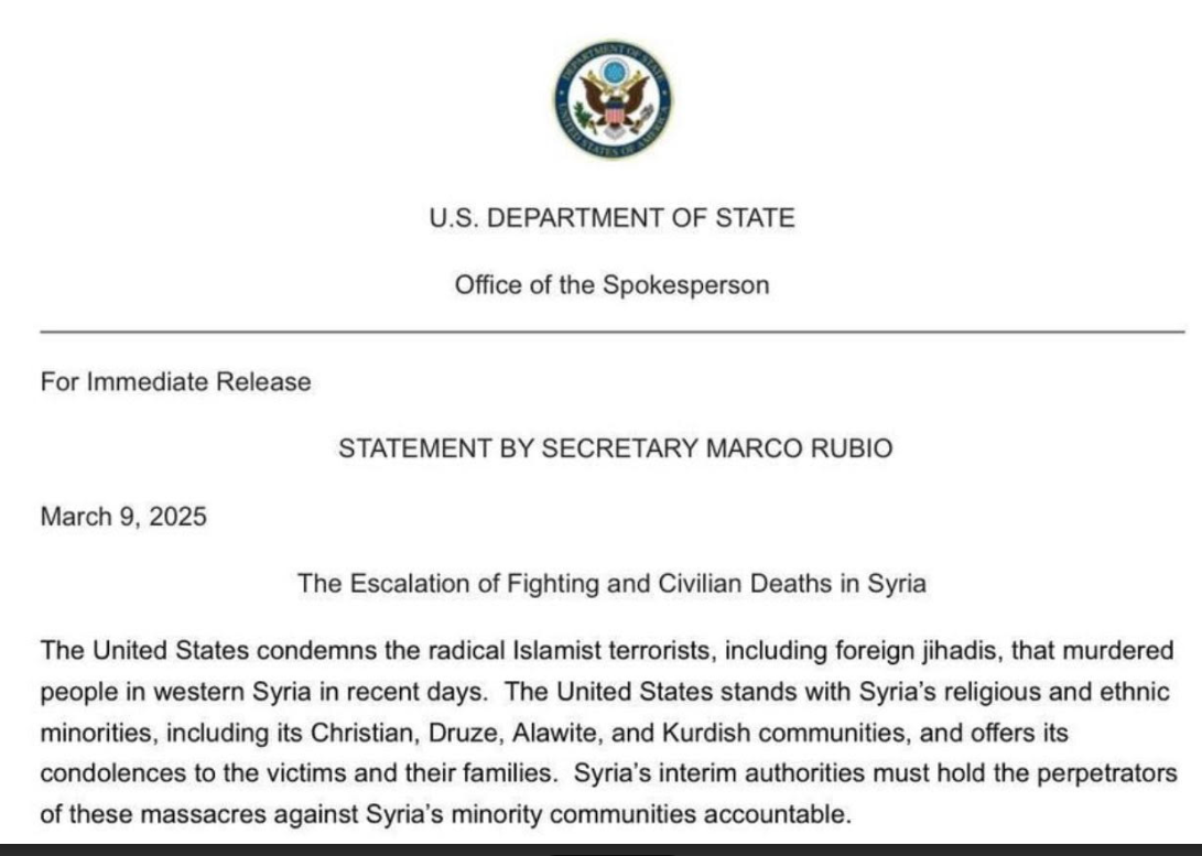 Νωρίτερα σήμερα (9/3) ο Αμερικανός υπουργός Εξωτερικών καταδίκασε τις «σφαγές» μειονοτήτων που εκτυλίσσονται στη Συρία και κάλεσε τις αρχές να καταδιώξουν τους αυτουργούς: «Οι ΗΠΑ καταδικάζουν τους ριζοσπάστες ισλαμιστές τρομοκράτες, μεταξύ αυτών ξένους τζιχαντιστές, που δολοφονούν ανθρώπους στη δυτική Συρία τις τελευταίες ημέρες», λέει ο Μάρκο Ρούμπιο.