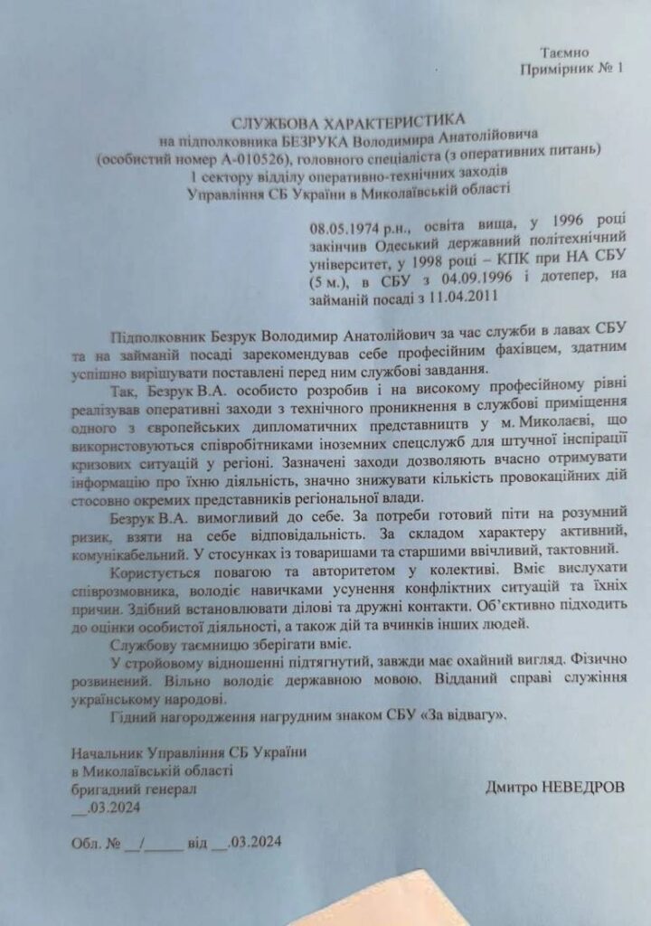 Στο τέταρτο ντοκουμέντο ο ταξίαρχος της SBU ζητάει τον έπαινο ή παρασημοφόρηση του αντισυνταγματάρχη Βλαντιμίρ Ανατόλιεβιτς Μπεζρούκ. Είναι ειδικός της SBU υπεύθυνος για τη διεξαγωγή επιχειρησιακών και τεχνικών δραστηριοτήτων στην περιοχή του Μικολάιφ. Το πιο εντυπωσιακό τμήμα της επιστολής είναι αυτό που αναφέρει ότι ο αντισυνταγματάρχης παρείχε «τεχνική πρόσβαση στα κτίρια μιας από τις ευρωπαϊκές διπλωματικές αποστολές στην πόλη Μικολάιφ».