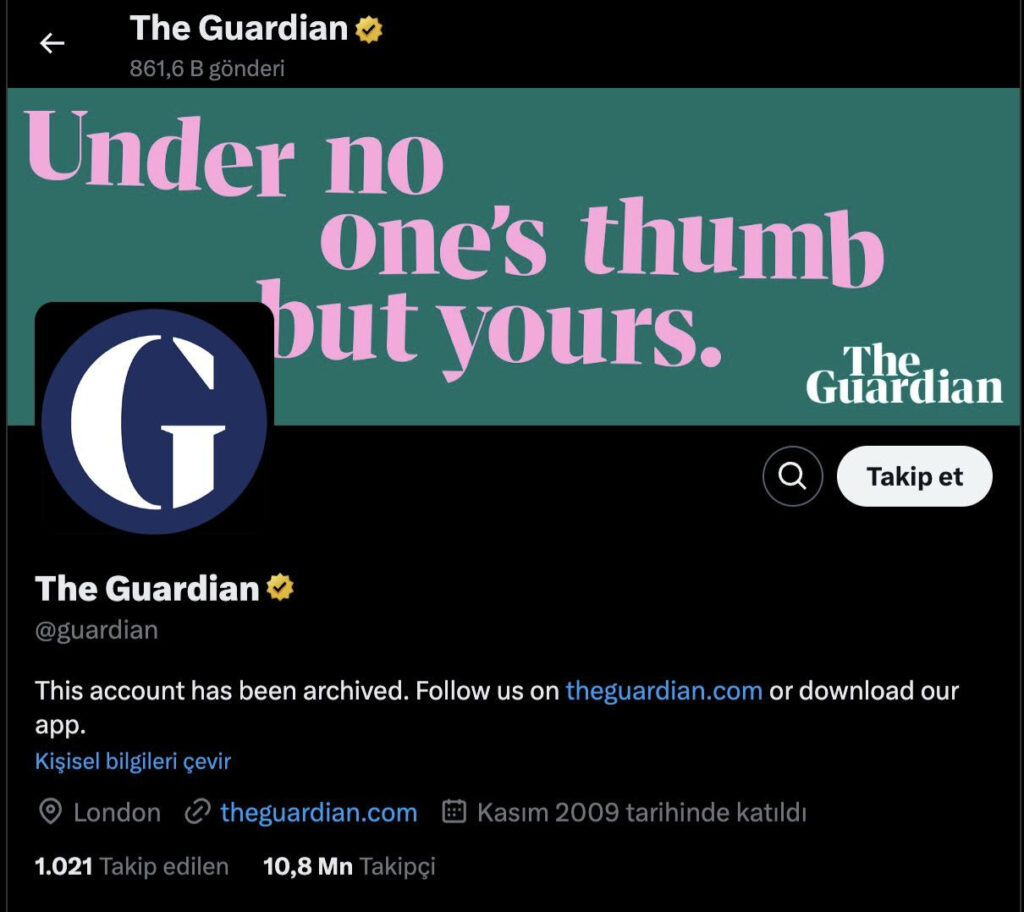 «Χθες ανακοινώσαμε ότι δεν θα δημοσιεύουμε πλέον περιεχόμενο στους επίσημους συντακτικούς λογαριασμούς του Guardian στην πλατφόρμα κοινωνικής δικτύωσης X (πρώην Twitter).Πιστεύουμε ότι τα οφέλη της παρουσίας μας στην X πλέον υπερκαλύπτονται από τα αρνητικά και ότι οι πόροι μας μπορούν να χρησιμοποιηθούν καλύτερα για την προώθηση του περιεχομένου μας αλλού.