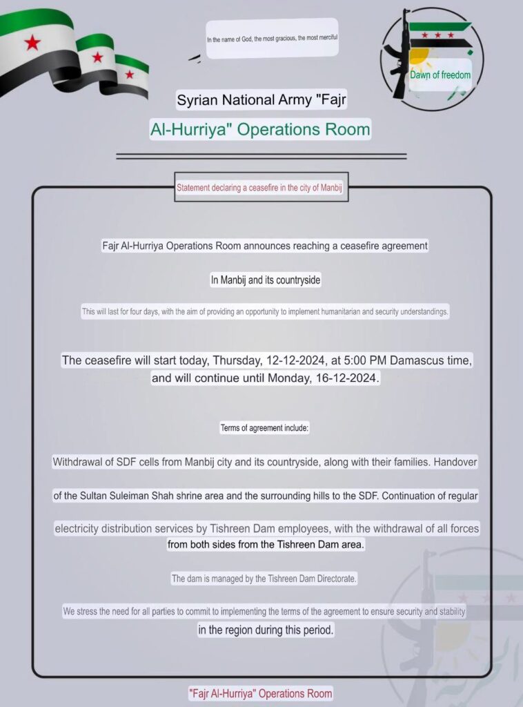 Στο μέτωπο του Κουρδικού, οι SDF (η συμμαχία υπό τους Κούρδους) θα παραδώσουν τις περιοχές γύρω από το Μαυσωλείο του Σουλεϊμάν Σαχ, που είναι τουρκικός θύλακας, στις δυνάμεις του Εθνικού Συριακού Στρατού (SNA) που υποστηρίζονται από την Τουρκία. Το μαυσωλείο του Σουλεϊμάν Σαχ, βρίσκεται βορειοανατολικά του Χαλεπιού και θεωρείται τουρκικό έδαφος βάσει της συνθήκης που υπέγραψε η Τουρκία με τη Γαλλία το 1921, όταν η Συρία ήταν υπό γαλλική κυριαρχία. Οι δυνάμεις των SDF θα έχουν την άδεια να αποχωρήσουν από την περιοχή του Μανμπίτζ μαζί με τις οικογένειές τους. Και οι δύο δυνάμεις θα αποχωρήσουν από το φράγμα Τισχρίν, το οποίο θα διοικείται από πολιτική διοίκηση.