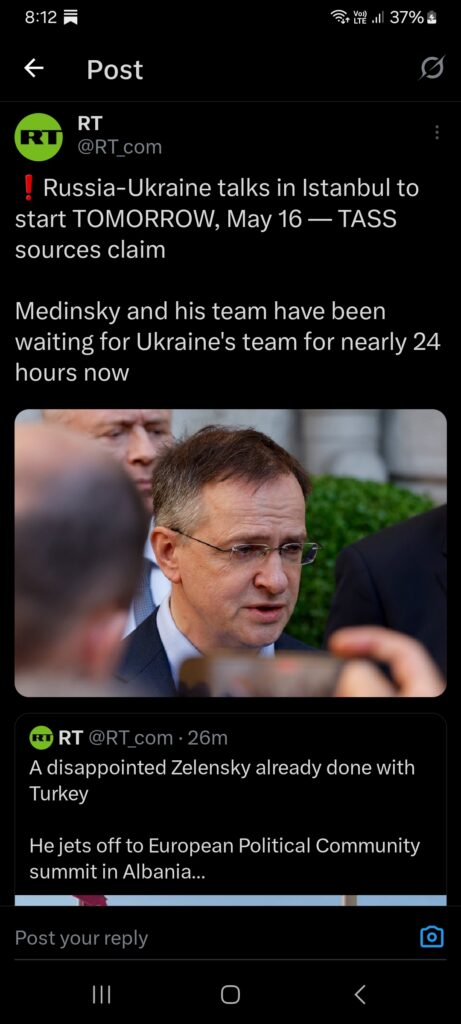 Προς το παρόν, δεν υπάρχει κάποια ανακοίνωσε σχετικά με την έναρξη των διαπραγματεύσεων στην Κωνσταντινούπολη, που φαίνεται να πηγαίνουν για Παρασκευή. Οι συνομιλίες θα ξεκινήσουν Αύριο, 16 Μαΐου, σύμφωνα με πηγές του TASS. Ο δε Τούρκος υπουργός Εξωτερικών Χακάν Φιντάν θα συναντηθεί απόψε με την ρωσική αντιπροσωπεία στο Ντολμάμπαχτσε.