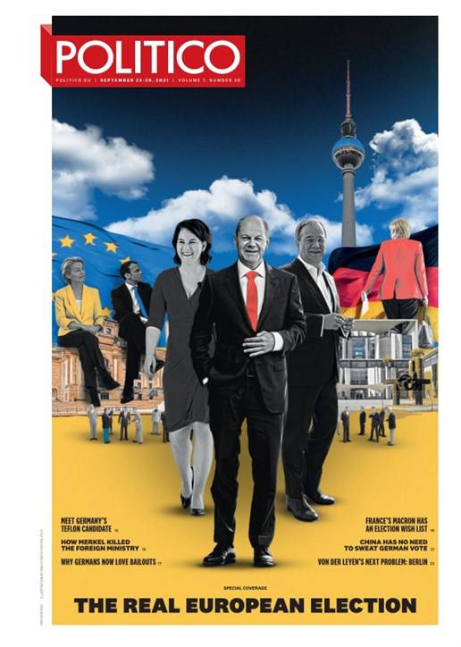 Η ευρωπαϊκή έκδοση του Politico, στο πιο πρόσφατο τεύχος του, αναγράφει “Η πραγματική ευρωπαϊκή εκλογή” και συμπεριλαμβάνει στο επίκεντρο του εξωφύλλου του τους τρεις βασικούς υποψηφίους για την καγκελαρία. Περισσότερο ενδιαφέρον όμως έχουν οι λεπτομέρειες στο φόντο: η πλάτη της Μέρκελ να αποχωρεί από τη μία, Μακρόν και φον ντερ Λάιεν να παρακολουθούν σκεπτικοί από την άλλη. Η έκβαση των εκλογών προβληματίζει περισσότερο το Παρίσι και τις Βρυξέλλες απ’ ό,τι το Πεκίνο, εκτιμά το Politico, όπως προκύπτει και από τα άρθρα που φιλοξενεί.