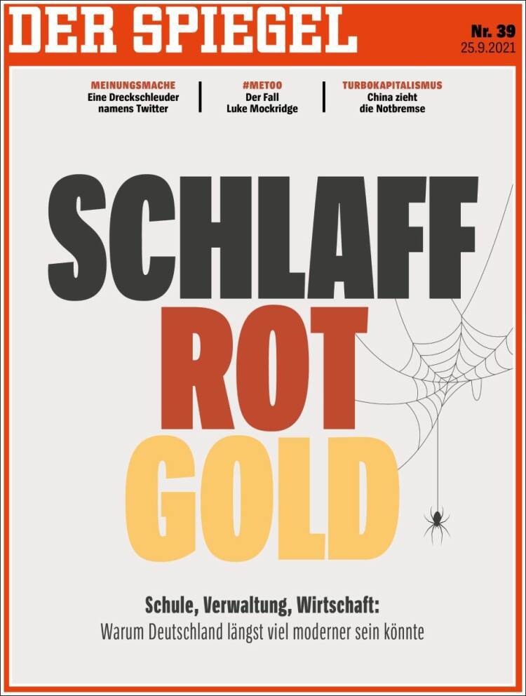 Το γερμανικό Der Spiegel φωτίζουν τα χρώματα της γερμανικής σημαίας, ενώ ο υπότιτλος του εστιάζει, εν αντιθέσει με τα προηγούμενα έντυπα, στα θέματα ασκούμενης πολιτικής και λιγότερο στα πρόσωπα. «Σχολείο, διοίκηση, οικονομία: γιατί η Γερμανία θα μπορούσε εδώ και πολύ καιρό να είναι πολύ πιο σύγχρονη» διαβάζει κανείς σε αυτό, μία πρόταση που ασκεί έμμεσα κριτική στην πολιτική της Μέρκελ, ενόψει μίας δύσκολης αναμέτρησης για τους Χριστιανοδημοκράτες.