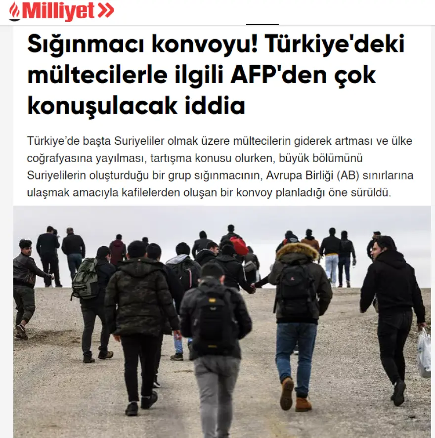 Το δημοσίευμα της Milliyet, παραβλέπει όλα όσα γίνονται στα σύνορα Τουρκίας-Συρίας και τις ευθύνες των τουρκικών δυνάμεων και των συμμαχικών τους ισλαμιστικών οργανώσεων και προαναγγέλλει προσφυγικό κύμα προς την Ευρώπη, ανάλογο με αυτό που επιχειρήθηκε τον Μάρτιο του 2020 μέσω του Έβρου, με την παρακίνηση και του ίδιου του προέδρου Ερντογάν.