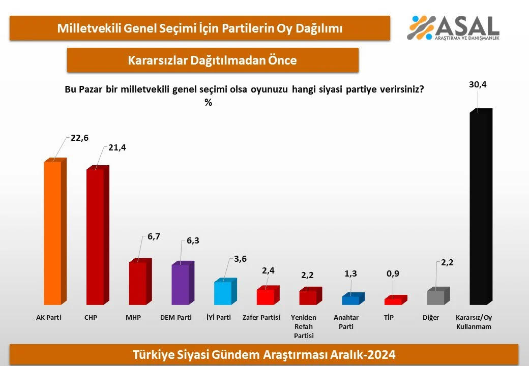 Σύμφωνα με την έρευνα, αφού κατανέμονται οι αναποφάσιστοι, το κυβερνών κόμμα (AKP) βρίσκεται στην πρώτη θέση με ποσοστό 32,5%, ενώ το CHP ακολουθεί στη δεύτερη θέση με 30,7%.