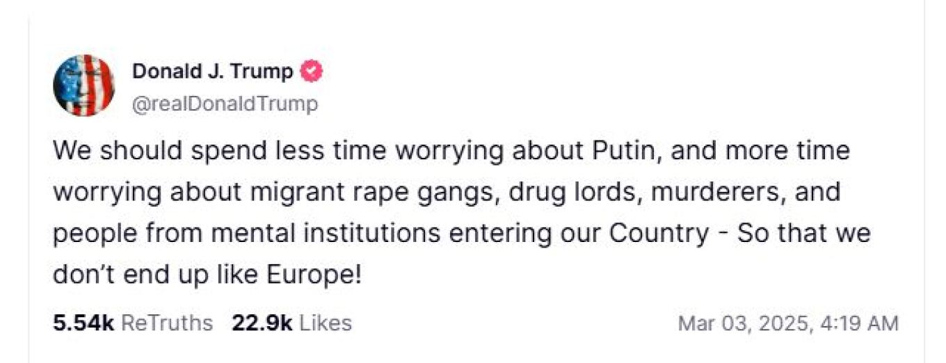 Ο Τραμπ καταλήγει λέγοντας πως όλα αυτά θα πρέπει να τα κάνουν οι Αμερικανοί «για να μην καταντήσουμε όπως η Ευρώπη». Συγκεκριμένα ο Τραμπ έγραψε: «Θα πρέπει να περνάμε λιγότερο χρόνο ανησυχώντας για τον Πούτιν, και περισσότερο για τις συμμορίες των μεταναστών που βιάζουν, τους βαρώνους ναρκωτικών, τους δολοφόνους και τους ανθρώπους από ψυχιατρικά ιδρύματα που μπαίνουν στη χώρα μας – Για να μην καταντήσουμε όπως η Ευρώπη!».
