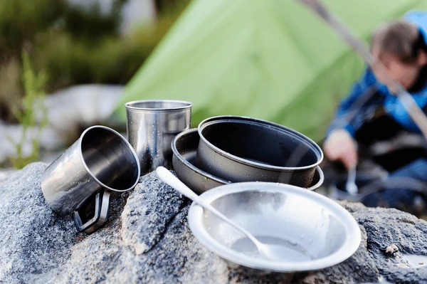 Πιάτα- πιρούνα (μιας χρήσεως – για να μη χρειάζεται να πλένετε) και ποτήρια-θερμός για να κρατάνε θερμοκρασία. Δεν υπάρχει πολυτέλεια για πολλά σκεύη και εργαλεία, επομένως πρέπει να αρκεστείτε στα βασικά. Δύο καλά μαχαίρια (ένα μεγάλο και ένα μικρό), κουτάλα, πηρούνα – κατά προτίμηση όχι ξύλινες για να πλένονται πιο εύκολα