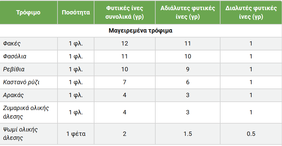 Στο σημείο αυτό, αξίζει να αναφέρουμε πως απότομη αύξηση της κατανάλωσης φυτικών ινών μπορεί να προκαλέσει γαστρεντερικές ενοχλήσεις, γι’ αυτό και η ένταξή τους στη διατροφή πρέπει να γίνεται σταδιακά με παράλληλη αύξηση της κατανάλωσης νερού. Στον παρακάτω πίνακα μπορείτε να δείτε την περιεκτικότητα των πιο συνηθισμένων τροφίμων σε φυτικές.