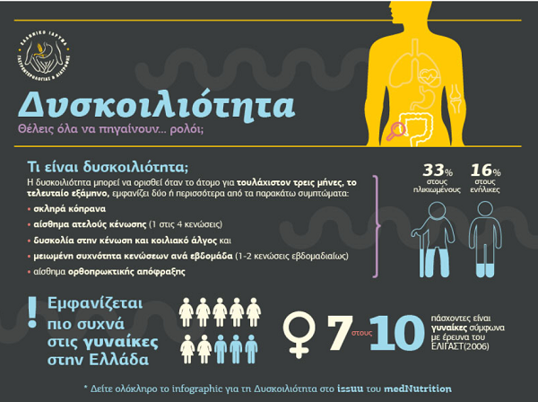 Η δυσκοιλιότητα είναι ένα σύμπτωμα που επηρεάζει την ποιότητα ζωής και τουλάχιστον ένα στους πέντε ενήλικες στην Ελλάδα την έχει αντιμετωπίσει, έστω και μία φορά. Ταλαιπωρεί πιο συχνά τις γυναίκες, τους ηλικιωμένους και τα άτομα, που δεν έχουν φυσιολογικό σωματικό βάρος και είναι είτε ελλιποβαρείς, είτε υπέρβαροι ή παχύσαρκοι.