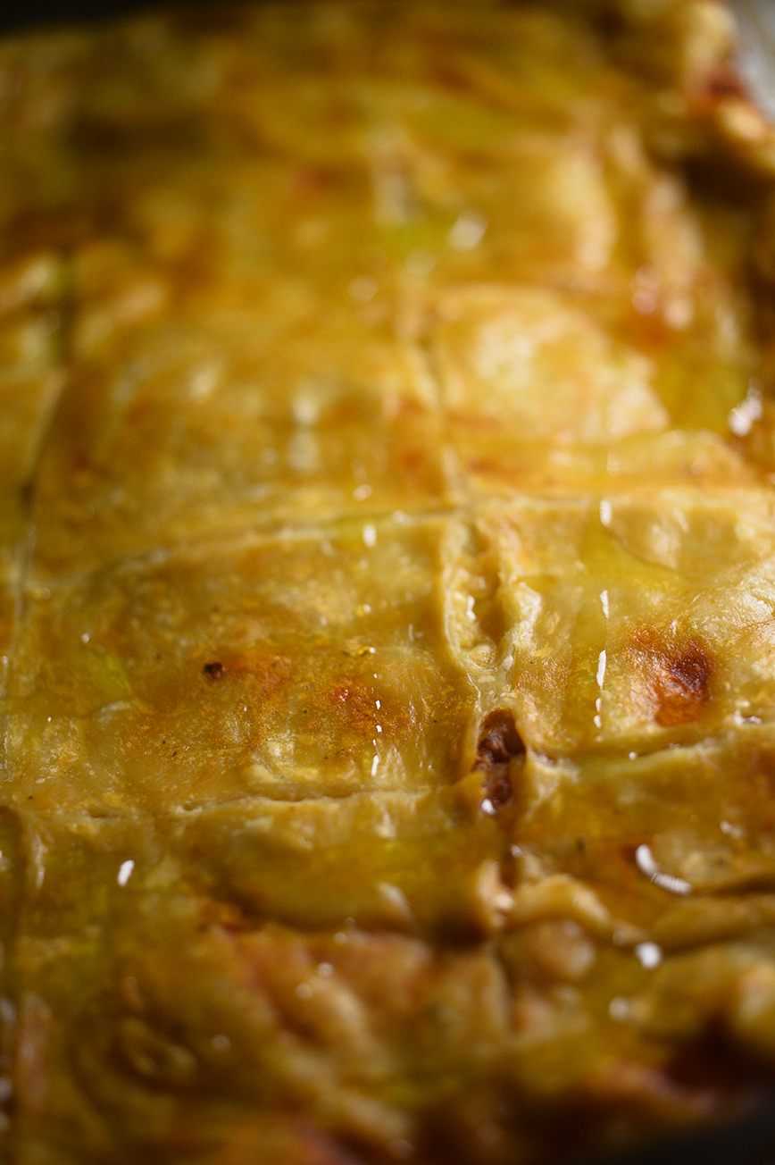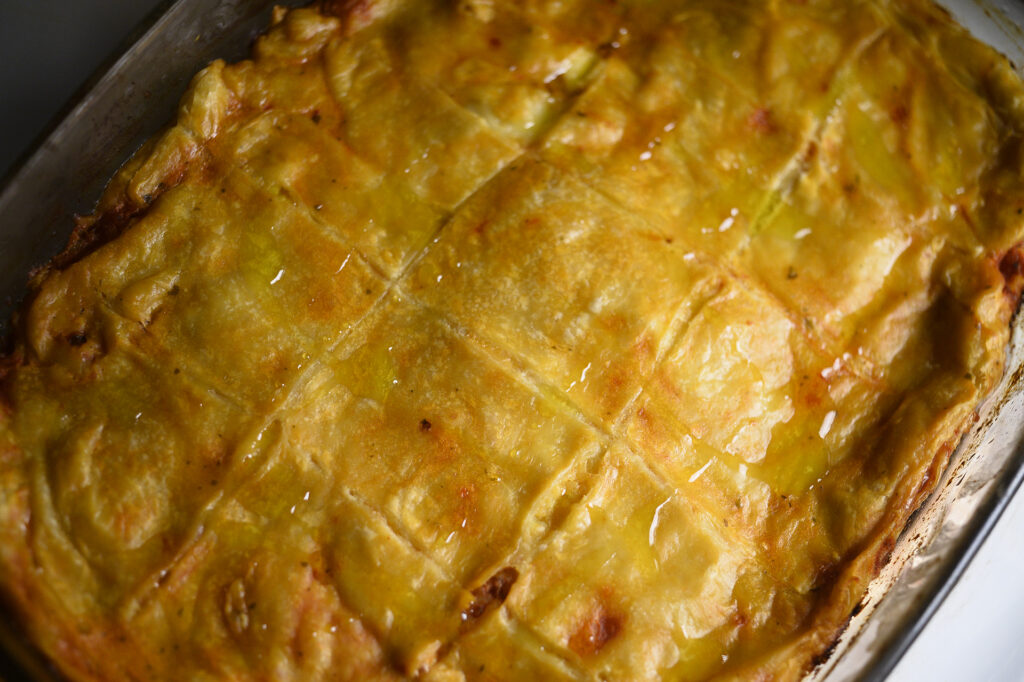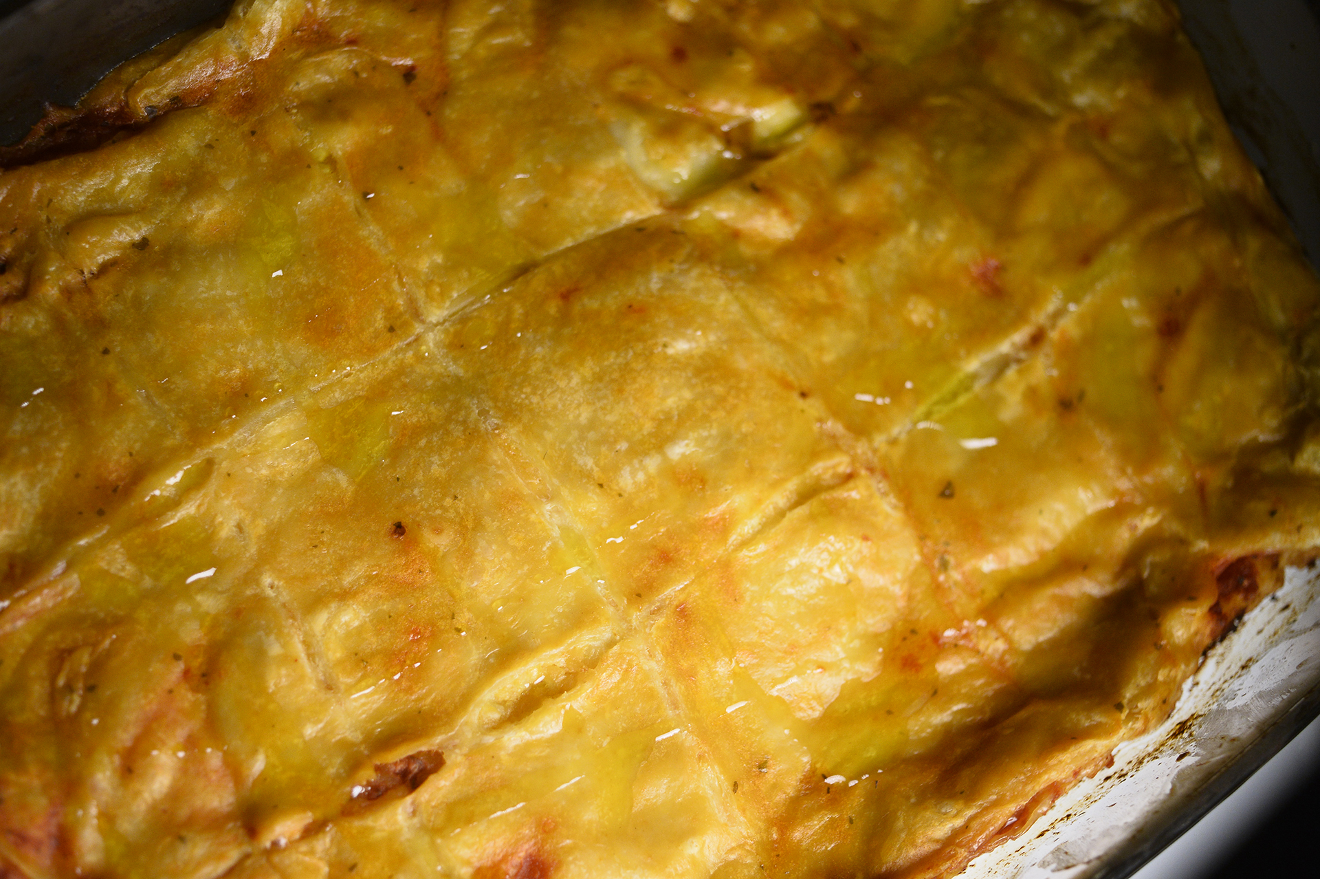 Βάζουμε το πυρέξ στον φούρνο και κατεβάζουμε τη θερμοκρασία στους 150 βαθμούς. Αν σε μισή ώρα δούμε ότι δεν έχει λιώσει ακόμα το τυρί, βάζουμε στο φούλ το γκριλ με ένα αλουμινόχαρτο από πάνω, για να μην καεί το φύλλο. Σε 10 λεπτά αφαιρούμε από τον φούρνο και περιμένουμε 5 λεπτά να ξεκουραστεί. Χαράζουμε με το μαχαίρι τις μερίδες που θέλουμε και μετά προσεκτικά κόβουμε και σερβίρουμε.