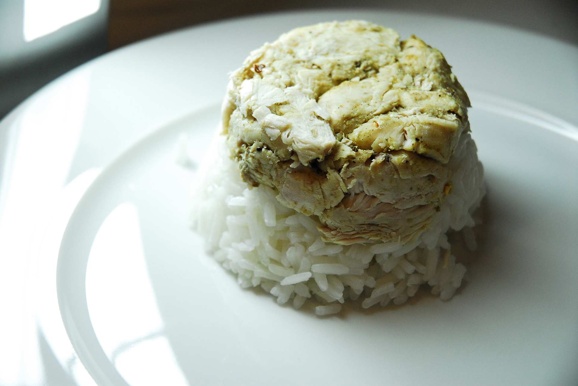 Αφού ολοκληρωθεί η διαδικασία του ατμού, αφαιρούμε τα κομμάτια κοτόπουλου από το πανί και τα βάζουμε στον πάτο μιας μεταλλικής φόρμας. Στην περίπτωσή μας θα χρειαστούμε 2 φόρμες. Στη συνέχεια, συμπληρώνουμε στη φόρμα το ρύζι μέχρι επάνω.