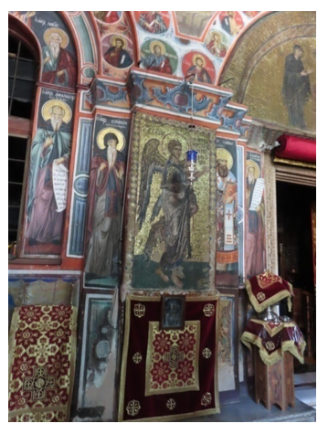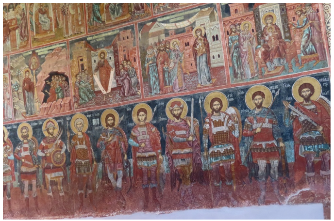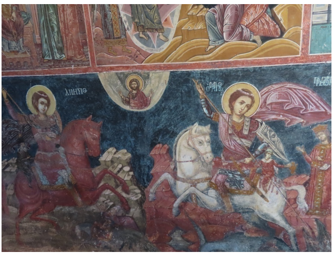 Παρατηρώντας στους εξωτερικούς τοίχους τους αγιογραφημένους ρωμφαιούχους και λογχοφόρους Άγιους της Εκκλησίας, όπως ο Άγιος Μερκούριος και ο Άγιος Νικήτας, ήρθε συνειρμικά στο νου μου το δημοτικό: «Του Πλαπούτα τ΄ άρματα και του Νικηταρά την πάλα».