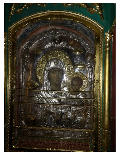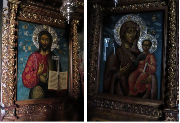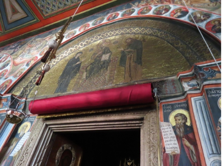 Δεξιά και αριστερά από την πύλη εισόδου στη Λιτή βρίσκονται τοποθετημένες οι δεσποτικές εικόνες της Παναγίας και του Χριστού, ρωσικής τεχνοτροπίας, δωρεά του Τσάρου Μέγα Πέτρου από τον 17ο αιώνα. Μια ακόμα ένδειξη για το πόσο πίσω πάνε η σχέσεις του Αγίου Όρους με την Ρωσία.