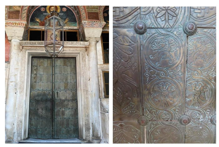 Η κεντρική δίφυλλη πύλη εισόδου στον κυρίως ναό του Καθολικού, η λεγόμενη και «Χυτή», καλύπτεται από μπρούντζινες εγχάρακτες πλάκες, με τους θυρεούς των Καντακουζηνών και των Παλαιολόγων, υπό την σκέπη μιας εξαιρετικής ωραιότητας εικόνα του Παντοκράτορα.Η πύλη αυτή οδηγεί στον Νάρθηκα του Ναού και λέγεται ότι προέρχεται από τον Ναό της Αγίας Σοφίας της Θεσσαλονίκης.
