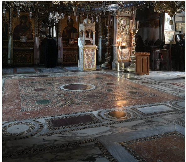 Λίγα μέτρα στ΄ αριστερά της κρήνης, πίσω από κάποια δέντρα και πολύ κοντά στο Καθολικό, είδαμε μια εκκλησία που η μπροστινή της πρόσοψη ήταν σκεπασμένη με μεγάλα πάνινα παραπετάσματα. Σε αυτό το παρεκκλήσι, μας οδήγησε ο ομιλητικότατος “ξεναγός μας. Εκεί, στο μισοσκόταδο, είδαμε τις αναστηλώσεις που γίνονται εντός του Ναού, αλλά και τις αρχαιολογικές εργασίες, οι οποίες φαίνεται πως μπορεί να οδηγήσουν στο συμπέρασμα πως οι θεμελιώσεις ναού που βρέθηκαν μπορεί να ανάγονται και στον 4ο αιώνα μ.Χ.