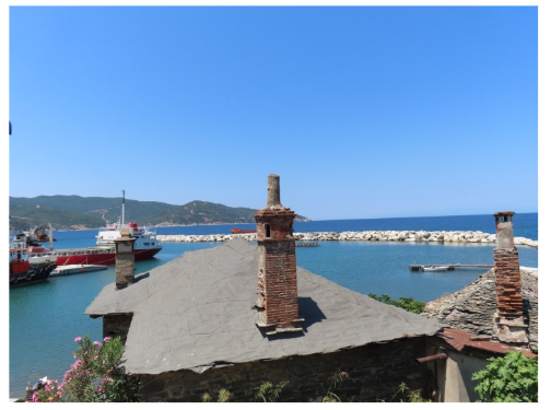 Είχε μεσημεριάσει για καλά όταν με οδηγό τον μηχανικό της Μονής ξεκινήσαμε για την επί τόπου επιθεώρηση των αναστηλωτικών έργων στη βατοπαιδινή Σκήτη του Αγίου Δημητρίου. Προηγουμένως περάσαμε από τους αρσανάδες στο λιμάνι της Μονής.