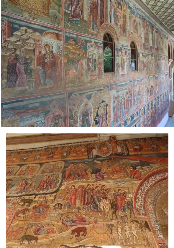Η πρόσοψη του Νάρθηκα στην είσοδο του Καθολικού είναι καλυμμένη σε σειρές με πολυπρόσωπες και σχεδόν αδιαχώριστες τοιχογραφίες, με έντονους χρωματισμούς. Πρόκειται για αναπαραστάσεις από τη ζωή της Παναγίας και στιγμιότυπα από την Καινή και την Παλαιά Διαθήκη.