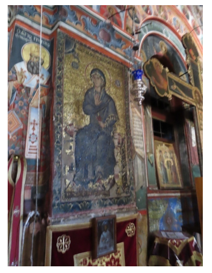 Εδώ, υπό την σκέπη μιας εικόνας του Παντοκράτορα, έχει τοποθετηθεί και το νεκρικό σάβανο, όπως λέγεται, του Βασιλέα Ιωάννη και Μοναχού Ιωάσαφ, όταν το 1383 «οσίως και θεοφιλώς τον βίον ετελεύτησεν».