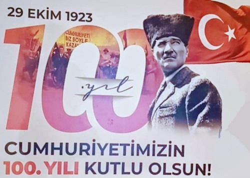Στους εμπορικούς δρόμους οι κούκλες στις βιτρίνες μαζί με τα φανταχτερά φορέματα κρατούν και την… τουρκική σημαία, ενώ σε άλλες βιτρίνες τα 100 χρόνια δημοκρατίας προβάλλονται με αυτοκόλλητα υπερμεγέθη γράμματα. Αφίσες αλλά και τρυκ με το πορτρέτο του αναγεννητή της Τουρκίας Ατατούρκ και στις τηλεοπτικές μεταδόσεις ειδήσεων, αθλητικών διοργανώσεων, σε φωτεινές επιγραφές. “Με σεβασμό κι ευγνωμοσύνη για την δημοκρατία στην Τουρκία”, γράφουν οι περισσότερες αφίσες κι άλλων πόλεων.