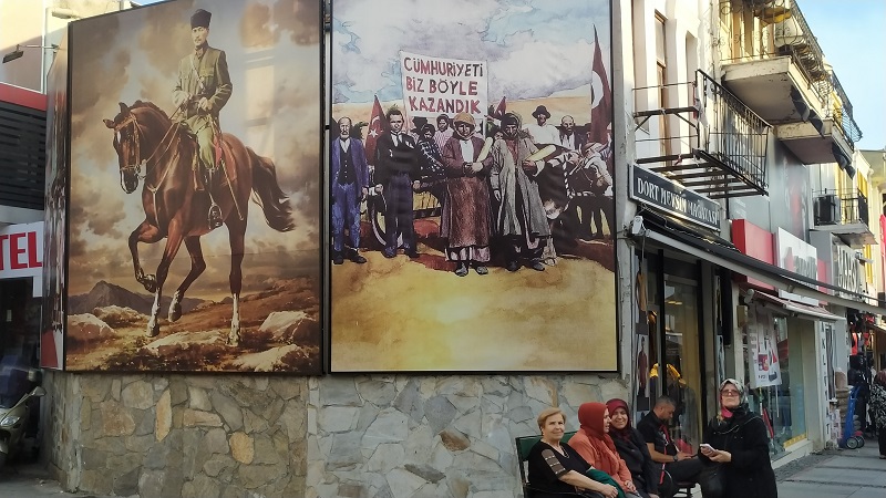 Στο οδοιπορικό μας στην Τουρκία, αν και κινηθήκαμε στην Ανατολική Θράκη, το πιο προοδευτικό κομμάτι της χώρας, η εθνικιστική ατμόσφαιρα είναι ορατή και μάλιστα προκλητικά επιδεικτική. Η γιορτή των 100 χρόνων από την εγκαθίδρυση της τουρκικής Δημοκρατίας το 1923 από τον μεταρρυθμιστή Κεμάλ Ατατούρκ μπορεί να έχει περάσει, αλλά τα πανό, οι γιγαντοαφίσες, οι άπειρες τουρκικές σημαίες παντού σε δημόσιους και ιδιωτικούς χώρους, δημιουργούν αυτό το ιδιαίτερο κλίμα ενός λαού ταυτισμένου με τη μοίρα και την ιστορία του, όπου η έννοια της πατρίδας είναι κραυγαλέα έντονη.