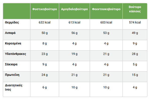 Ακολουθεί σύγκριση της διατροφικής αξίας του βουτύρου αμυγδάλου, του βουτύρου φουντουκιού, του φυστικοβούτυρου και του βουτύρου κάσιους στα 100g. Να σημειωθεί ότι αναφερόμαστε στα βούτυρα που αποτελούνται από 100% ξηρούς καρπούς, χωρίς την προσθήκη ζάχαρης:
