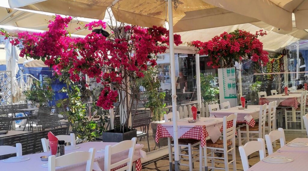 Τα καφέ με το ιδιαίτερο χρώμα, τα άνετα σαλόνια, την καλοκαιρινή διακόσμηση, δεν περιορίζονται στα ροφήματα, αλλά προτείνουν συνθέσεις ελληνικού πρωινού, τοπικά γλυκά, εξαιρετικά παγωτά, ενώ εμβόλιμα εκεί στην όμορφη παραλία τα τοπικά εστιατόρια με τις αναρριχώμενες κόκκινες βουκαμβίλιες καλύπτουν όλα τα γούστα σε κρεατικά, ψάρια, ή βετζετέριαν απολαύσεις.