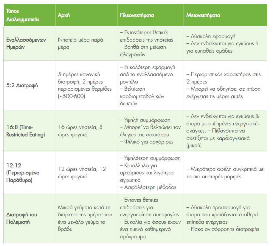 Πώς Διαφέρει από τις Παραδοσιακές Δίαιτες Οι παραδοσιακές δίαιτες εστιάζουν στο θερμιδικό έλλειμμα και την ποιότητα της διατροφής. Αντίθετα, η διαλειμματική νηστεία δεν σου λέει τι να φας αλλά πότε να φας. Αυτό την κάνει πιο ευέλικτη, αλλά καταλαβαίνεις πως για κάποιους μπορεί να αποτελέσει παγίδα εάν δεν τρέφονται σωστά επειδή δεν τους ‘αναγκάζει’ η διατροφή που ακολουθούν. Περαιτέρω συζήτηση για τα αρνητικά της (εάν αυτά υπάρχουν ή/ και είναι σημαντικά δηλαδή) θα δούμε παρακάτω, ας μην προτρέχουμε ωστόσο, πάμε να δούμε πρώτα τα οφέλη της!