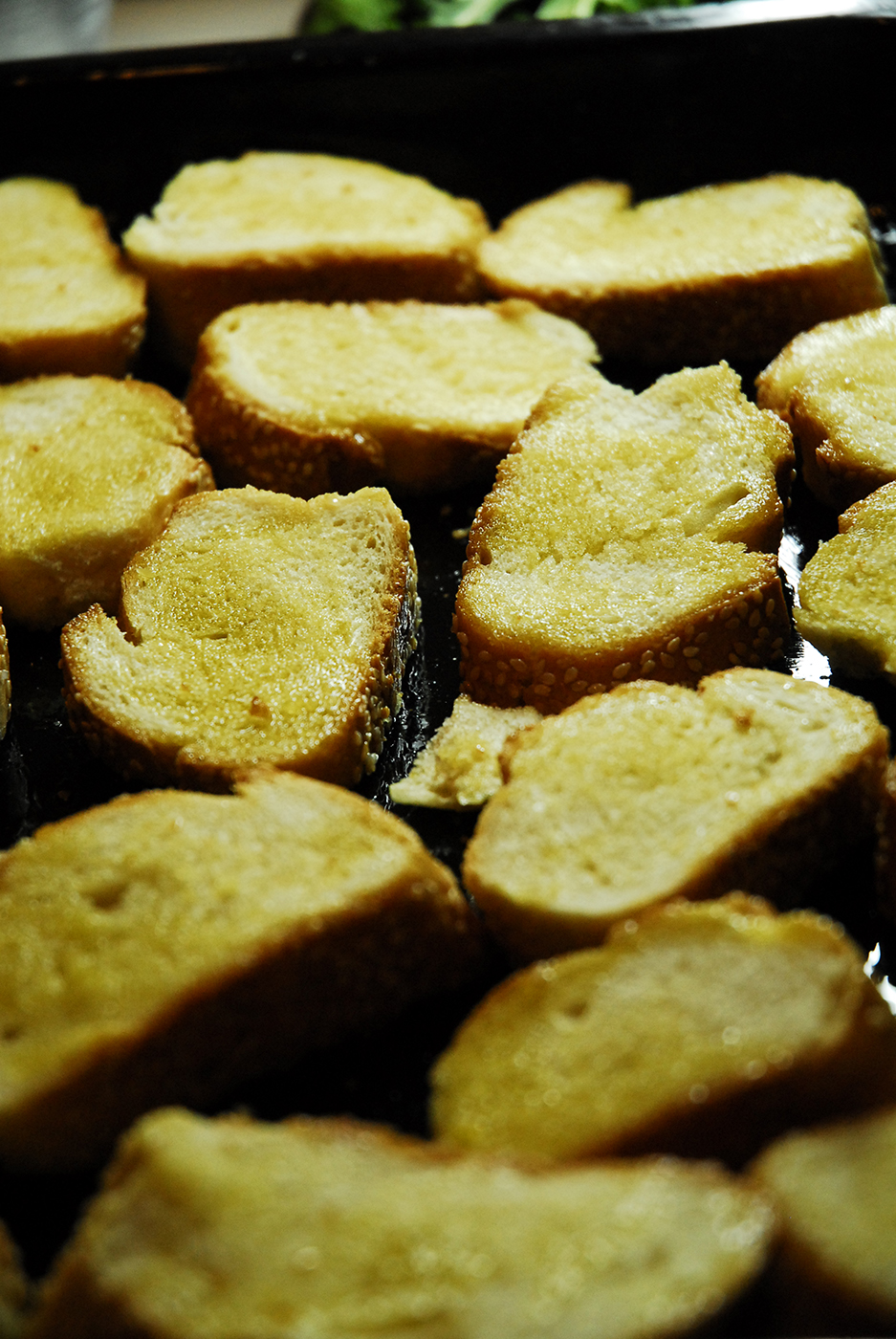 Παίρνουμε μπαγκέτα, τσιαπάτα ή ελληνική χωριάτικη φραντζόλα και κόβουμε λοξά σε φέτες πάχους ενός δαχτύλου. Φτιάχνουμε ένα μείγμα από ελαιόλαδο, αποξηραμένο και φρέσκο βασιλικό και ανακατεύουμε σε ένα μπολ. Με τη βοήθεια πινέλου, αλείφουμε τις φέτες ψωμιού και από τις δύο πλευρές.