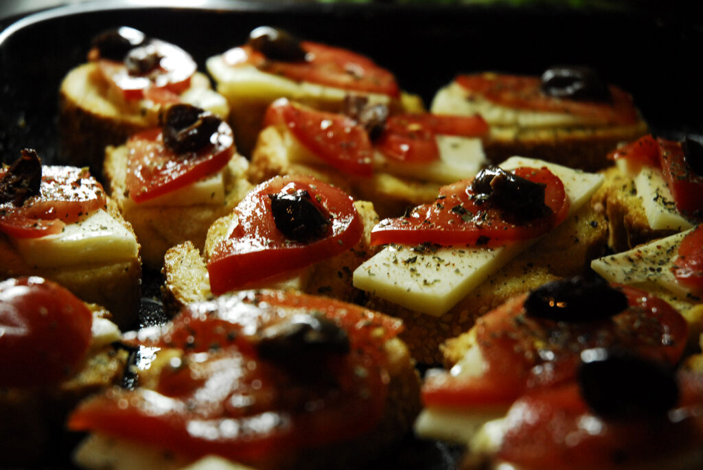 Παρόλο που στο πάνθεον της ιταλικής γαστρονομίας τα bruschetta περιλαμβάνουν τεράστια γκάμα γευστικών συνδυασμών, στην περίπτωσή μας θα ξεκινήσουμε με την απλούστερη και ίσως κλασικότερη συνταγή όλων: bruschetta με μοτσαρέλα, ντομάτα, ελιά και ρόκα.