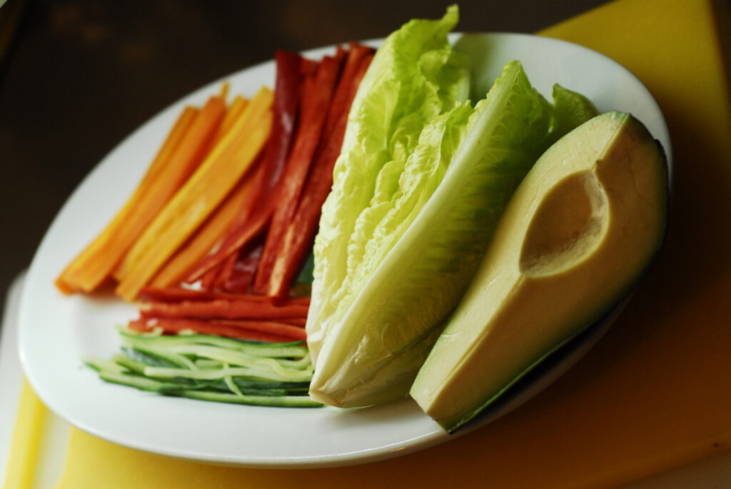 Κόβουμε το αβοκάντο σε λεπτές φέτες με φάρδος ενός δαχτύλου. Κόβουμε το αγγουράκι, το καρότο και την κόκκινη πιπεριά σε πολύ λεπτές λωρίδες. Κόβουμε με τον ίδιο τρόπο.
